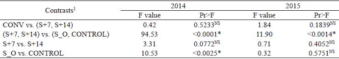 The number of sprayings were higher in the summer-fall crop season of 2015 as compared to 2014 since climatic factors strongly associated with outbreaks occurred at higher frequencies that year ( Table 2). In northern Paraná, grape producers have been using fewer sprayings than the standard treatment for ‘BRS-Vitória’, approximately 28-32 sprays, compared to the treatment of ‘BRS Clara’, a susceptible cultivar to downy mildew, that requires approximately 45-50 sprays in summer-fall crop season as reported by Genta et al. (2010). Attempts to reduce the number of fungicide applications for table grape cultivars in the region was performed by Abi Saab et al. (2002), where the goal was to increase the efficiency of control based on the quality of the fungicide application; however, they were unsuccessful in achieving this goal.