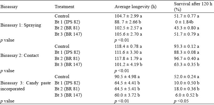 In the spraying bioassay of B. thuringiensis on A. mellifera (Bioassay 1), it was observed that only strain IPS 82 caused a reduction in longevity (88.7 h) when compared to the control (104.7 h). The other strains, BR 81 and BR 147 did not cause changes in the longevity of A. mellifera worker bees (Table 1).