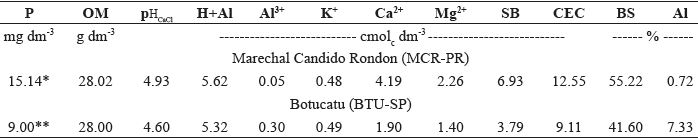 Two experiments were conducted in 2011. The first experiment was conducted in Marechal Cândido Rondon (MCR-PR), in the state of Parana, Southern Brazil, at the experimental farm of the West State University of Parana (24°33ʹS; 54°03ʹW, at 400 m a.s.l.). The second experiment was conducted in Botucatu (BTU-SP), in the state of Sao Paulo, Southwestern Brazil, at the experimental farm of Sao Paulo State University (22°58ʹS; 48°23ʹW, at 765 m a.s.l.). Both experiments were conducted on Oxisols following a conventional sowing system (Table 1). Soil tillage was performed in the layer from 0 to 20 cm with an intermediate grade followed by mild grade.