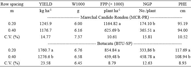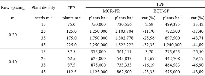 Plant mortality was greater at BTU-SP than at MCR-PR, varying from 26.50 to 48.89% in rows 0.40 m apart with 15 and 45 plants m-1, respectively (Table 3).