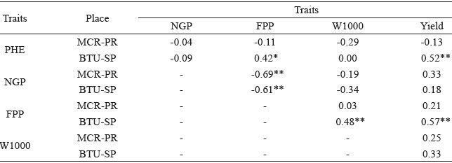 There was a highly significant negative correlation between NGP and FPP in both experiments. At BTU-SP, there were significant positive correlations between yield and PHE; and between yield and FPP. There were also significant, positive correlations between FPP and PHE; and between FPP and W1000 (Table 4).