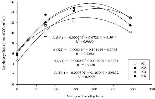 It was not possible to fit a multiple regression model for the net photosynthesis variable (A). Regression analysis revealed that only the doses of N in the K levels had significant differences which were fitted to the second-degree polynomial model (Figure 1).