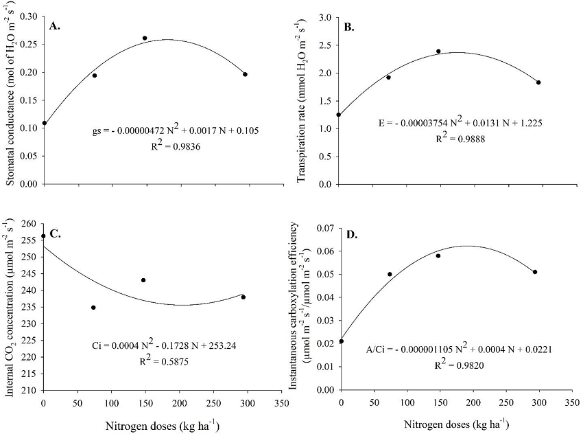 The value of the instantaneous carboxylation efficiency (A/Ci) increased up to 180.9 kg ha-1 of N, from which point it started to decrease, and was then better fitted into the quadratic model. The maximum estimated value of A/Ci was 0.058 µmol m-2 s-1/µmol m-2 s-1. According to Silva et al. (2015), high values of Ci associated with an increase of gs indicate increase in A/Ci because of the availability of ATP and NADPH. However, even at decreasing Ci values, the values of A/Ci found in the present study followed the same behavior as data on A, because of the nitrogen application. Melo et al. (2017) obtained similar results for A/Ci and Ci. According to these authors, the instantaneous carboxylation efficiency has a close relation with CO2 assimilation rate and the intracellular concentration of CO2.