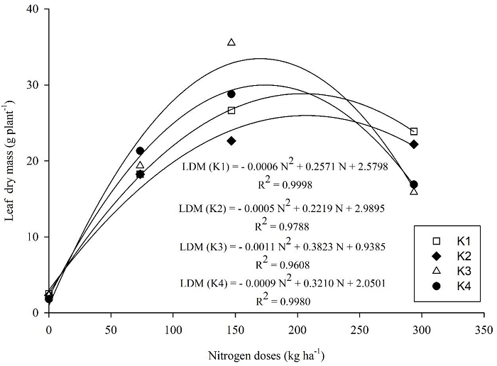 It was not possible to fit a multiple regression model for leaf dry mass (LDM). Regression analysis showed that N doses showed significant differences in LDM at each level of K tested, which fitted to the quadratic model; similarly, there were no significant differences in LDM at the tested K doses at each N level (Figure 3).
