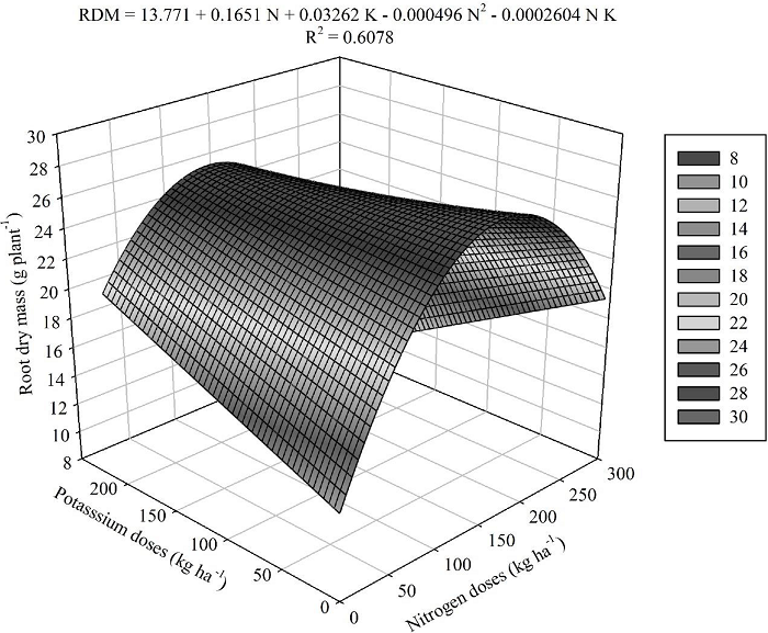 As for root dry mass (RDM), it was possible to fit a multiple regression model with N and K. In order to obtain the maximum value of RDM (26.67 g plant-1), 125.2 kg ha-1 of N and 213.4 kg ha-1 of K were needed. However, potassium doses below 213.4 kg ha-1 did not decrease the maximum value of RDM registered, as can be observed on the surface values (Figure 4). This effect can be explained by the addition of potassium to the pots before transplanting the bell pepper seedlings. As previously mentioned, high potassium content in the soil contributes to the plant absorption of this nutrient over the amount needed, which is characterized as luxury consumption, which results in an increase in plant growth variables.
