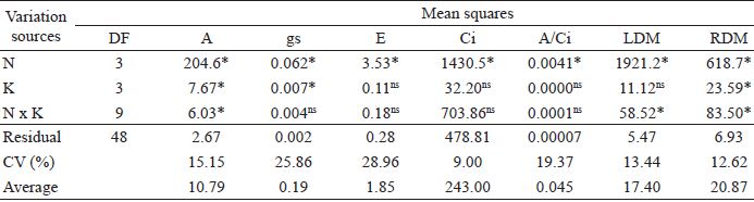 Significant (p<0.05) interaction was evidenced between the levels of nitrogen and potassium for the variables net photosnthesis (A), leaf dry mass (LDM) and root dry mass (RDM). As for the isolated effect of each factor, there were significant responses to nitrogen from all variables under study, while only net photosynthesis (A), stomatal conductance (gs) and root dry mass (RDM) responded significantly to the potassium doses tested in this experiment (Table 1).