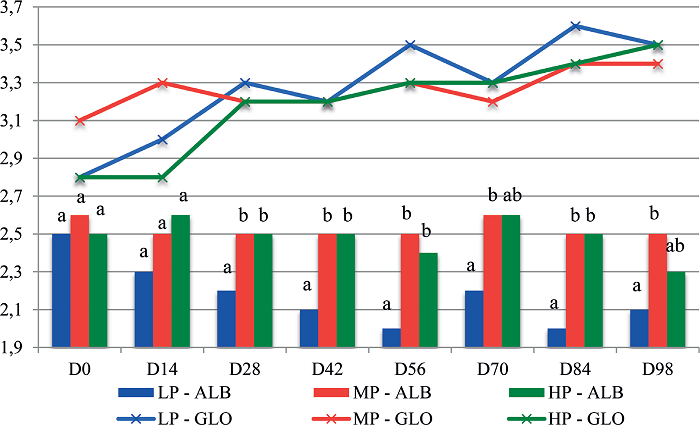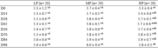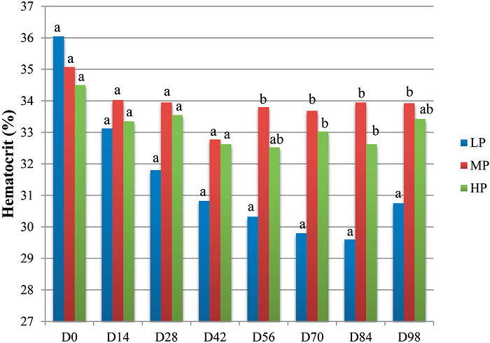Figure 1 shows a progressive decrease in the average Ht values of the LP group from D0 to D98 (p<0.05). However, in the MP and HP groups, no significant decrease (p>0.05) occurred in the Ht values throughout the experiment. Inter-group comparison of the Ht levels revealed that, starting from D56, significant differences were detected among the groups in mean Ht levels (p<0.05), with the values of the LP group always lower than those of the MP group.
