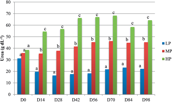 The average serum urea concentrations (Figure 3) increased significantly over time in the HP and MP groups, whereas those of the LP group decreased (p<0.05). Inter-group comparison revealed similar average serum urea concentrations among the three groups only on D0; from D14 onward, the values of the LP group were significantly lower than those of the MP group, which were lower than the values of the HP group (p<0.05).