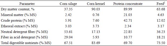 The feed was formulated to provide a gain of 1.5 kg of animal live weight day−1 (NRC, 2000). Food was supplied as fully mixed feed (TMR), and monensin was offered in TMR in order to guarantee total ingestion. The feed consisted of 50% corn silage and 50% concentrate. In preparation of the concentrate, the following foods were used: ground corn (70%) with a commercial protein core (30%) composed of soybean meal, soybean hull, barley radish, ground corn kernels, calcitic limestone, dicalcium phosphate, common salt, livestock urea and vitamin and mineral premix.