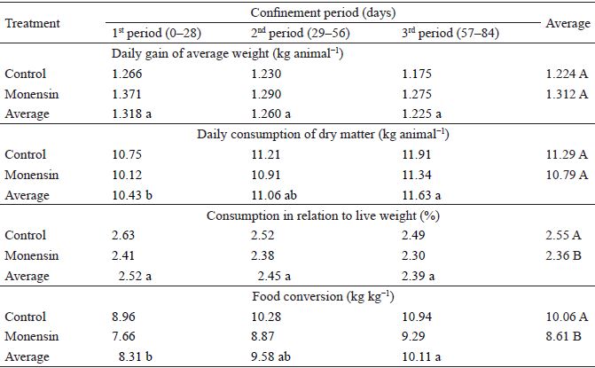 According to Table 2, there was no significant interaction (P > 0.05) between treatments and evaluation periods for ADG, or between confinement treatments for DMI, but for DMI there was a difference (P < 0.05) between periods, showing an increase in consumption by animals. PDMI and FC presented a difference (P < 0.05) between treatments, demonstrating that the animals treated with monensin showed lower PDMI and better FC. FC, however, worsened over time. This is due to the lower energy efficiency and the metabolism of the animals as maturity progresses, because, according to Owens et al. (1993), the deposition of adipose tissue occurring in later stages requires a greater energetic contribution in relation to the deposition of muscle tissue.