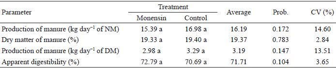 In Table 4, it is possible to verify that there was no significant effect of monensin on daily manure production or on DM AD.