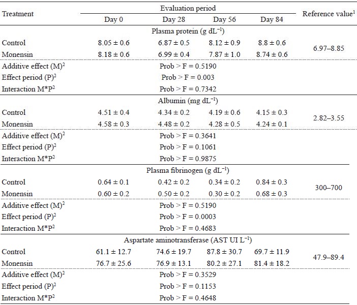 The inference that the inclusion of monensin does not cause inflammatory disorders is evidenced by fibrinogen, the main indicator of acute inflammation in ruminants (KANEKO, 2008), which in all evaluations remained below the reference values.