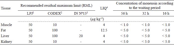 According to Table 6, no monensin residues were detected in the animal tissue samples, regardless of the waiting period. The concentrations of monensin obtained in different animal tissues (muscle, fat, liver and kidney) after 16, 32 and 56 h of product suppression prior to slaughter of animals (grace period) were lower than the residual ceilings imposed by the Japanese Positive List (2014), Codex Alimentarius (2014) and Normative Instruction Nº10 of BRASIL (2008). According to Donoho (1984), even in intoxicated animals, the concentrations of monensin in blood and tissue are relatively low.