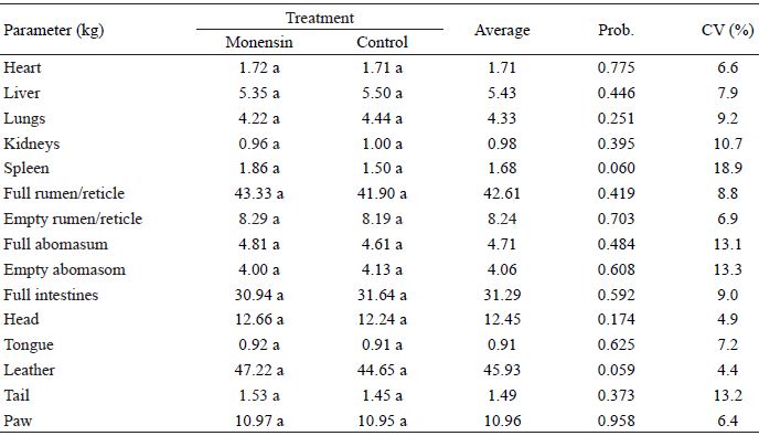 As for non-carcass components (Table 7), these were not altered (P > 0.05) by the addition of monensin to the feed. No significant differences were observed in treatments regarding the carcass return, so it is suggested that the organs represent the same proportion of the empty body (LADEIRA et al., 2014). Furthermore, the use of monensin at an appropriate dose did not compromise the anatomical structure of any organ, confirming the safety of its use in ruminant feeding.
