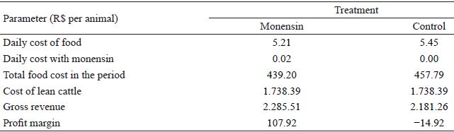 For economic analysis, the average regional prices occurring in 2014 were considered, which were: beef cattle at R$ 120.29 per @, beef cattle at R$ 4.61 per kg live, corn silage at R$ 0.25 per kg of DM, concentrated feed mixture at R$ 0.72 per kg of DM, and monensin at R$ 16.01 per kg of Rumimpex® product.