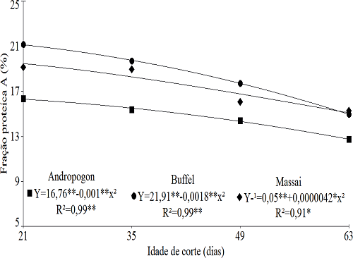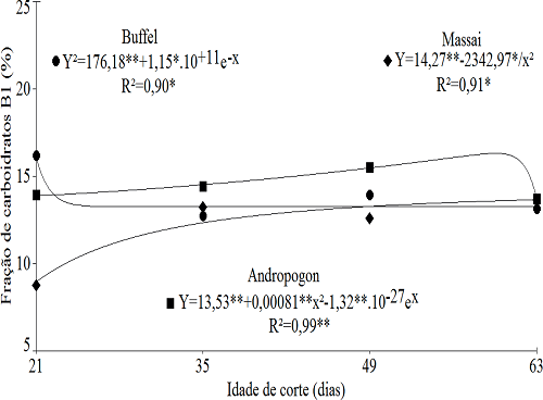 In relation to fraction B1, Andropogon and Buffel grasses showed the greatest decrease in content of this fraction between ages 21 and 63 days, while in the Massai species there was a reduction in B1 values, between ages 35 and 49 days.