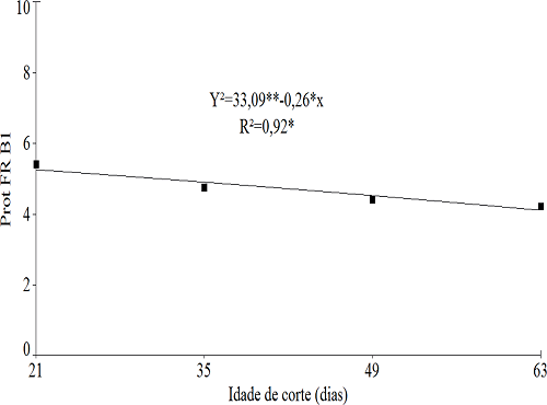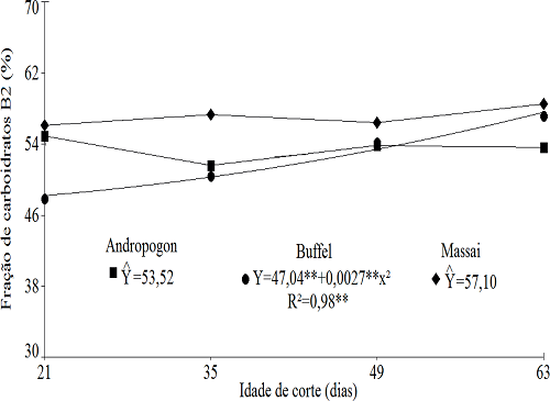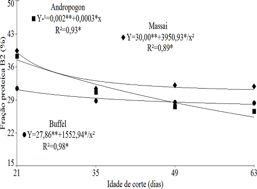 On the other hand, fraction B2 increased with increasing cutting age. Thickening of the secondary cell wall with maturation of plant tissues increases the concentration of NDF over cell content (WILSON, 1989; VELÁSQUEZ et al., 2010).