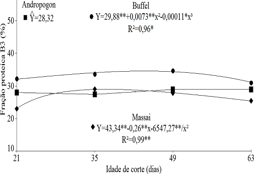 The slow degradation fraction (B3), increased with age. This fraction consists of proteins bound to the cell wall and are subjected to a slow rate of degradation, as they are digested mainly in the intestines (SÁ et al., 2010). In the Andropogon species, after decreasing from the first to the second age sampled, the value for fraction B3 increased over the last two age samplings. In the case of Buffel grass, there was a linear increase up to the third age, followed by a reduction at the last age sampling. In contrast, the Massai grass showed a great increase in B3 between ages 21 and 35 days, followed by a small decrease between ages 49 and 63 days. (Figure 4).