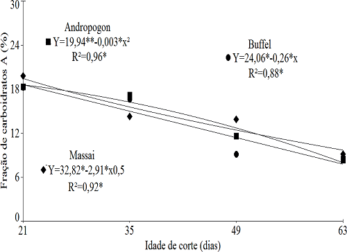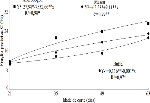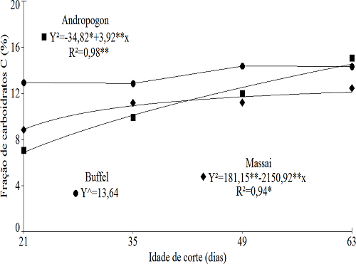 Fraction C, (Figure) showed an increasing linear behavior with cutting age, although in a grass dependent fashion. Thus, it varied between 7.07% and 15.08% of total carbohydrates percent in Andropogon grass and between 12.96% and 13.57%, for Buffel grass, which was likely related to abundant flowering in this species during the experiment. As for fraction C values for Massai grass, these varied between 8.86% to 12.45%, which were the lowest values for fraction C, probably due to the abundance of leaves in this species during these experiments, whereby the fraction of hemicellulose and cell wall indigestible cellulose, would be expected to increase. According to Van Soest (1994), the indigestible fraction of total carbohydrates tends to increase with plant maturity (RIBEIRO et al., 2001). However, there is a tendency for the indigestible proportion of lignin to increase with hay age, which is an undesirable effect from the nutritional point of view.