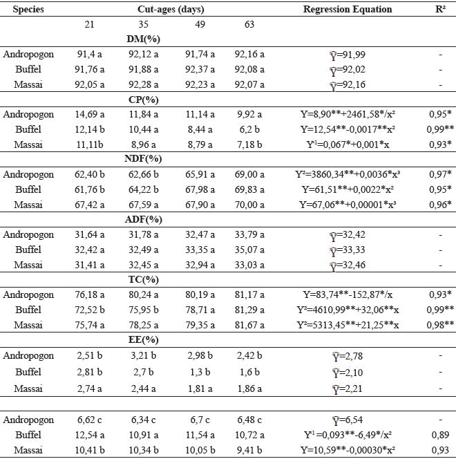 Analysis of Ethereal Extract (EE) showed no significant interaction between species and age (p <0.05), with decreasing amounts as cutting age increased in the three species in question. Values were found between: 3.21% and 1.3%. According to Van Soest (1994), tropical grasses usually have low levels of EE, which are basically essential oils (pigments, waxes, glycolipids and membrane phospholipids) or substances soluble in non-polar solvents, with negligible nutritional value.
