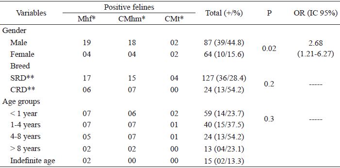 The prevalence of hemoplasmas in felines has already been described in several regions of Brazil. In this study, the prevalence of 25.8 % for hemoplasmas was lower than that obtained by SANTIS et al. (2014) and André et al. (2014) in Mato Grosso do Sul and São Paulo, respectively, but higher than those obtained in other Brazilian regions (BRAGA et al., 2012; AQUINO et al., 2014) and other countries (GHAZISAEEDI et al., 2014; DUARTE et al., 2015). According to Aquino et al. (2014), the difference in prevalence may arise from the study population. In this research, a high prevalence of felines originated from veterinary hospitals, in contrast to the prevalence of 8.4% in cats predominantly from animal pound observed by Miceli et al. (2013) in the same municipality.