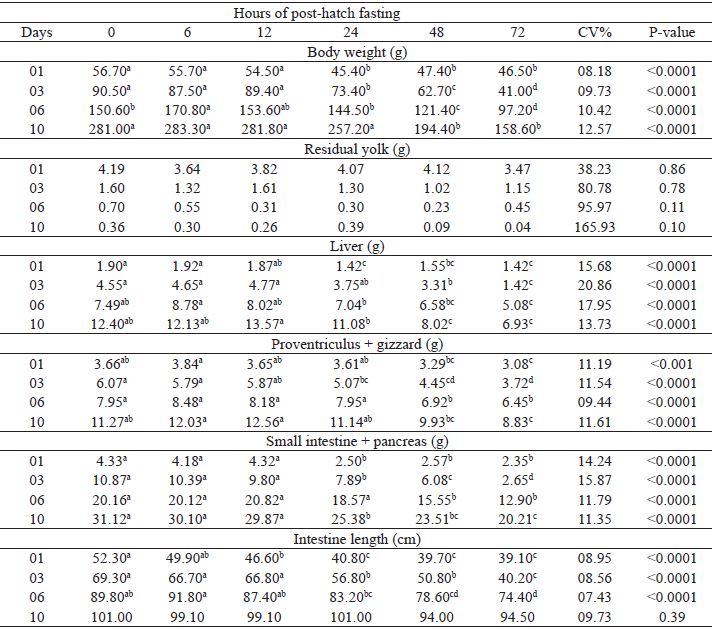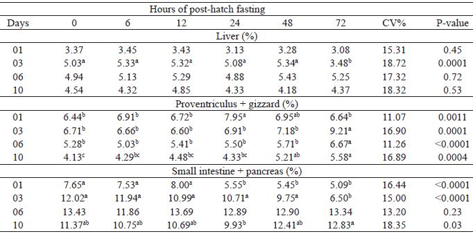 Then, ten chicks of each treatment were weighed and euthanized by cervical displacement on the days 01, 03, 06, and 10 corresponding to 24, 72, 144, and 240 hours after removal from the incubator, respectively. Afterwards, the residual yolk was weighed, total intestine length was measured, and organs were dissected, cleaned, and weighed. The relative weights of proventriculus + gizzard, intestine (small and large) + pancreas, and liver were estimated by the formula: (organ weight/body weight) x 100.