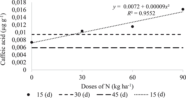 In the regression analysis of the Baianinha cultivar, the quadratic fit showed a maximum response of p-coumaric acid at 30 d, at the 27.5 kg ha-1 dose, whereas at 45 d there was a decreasing linear fit. In the Caiuá cultivar, there was no significant fit in response to the different doses of N (Figure 3). p-Coumaric acid is associated with microorganisms the rumen, and can be toxic if high concentrations are consumed (CARVALHO; PIRES, 2008). Similar data were obtained by Marschner (1995), who concluded that high concentrations of N decreased the production of some phenolic compounds that have a fungistatic action, including p-coumaric acid, and lignification of leaves, thereby reducing the resistance to obligate parasites while having no action on facultative parasites. Therefore, the use of cultivars with high contents of this compound may be troublesome for cassava producers who use the aerial part of the plant for animal feeding.
