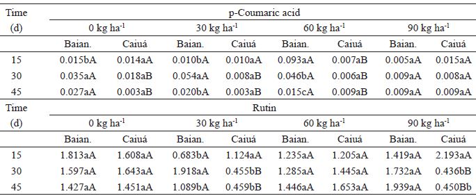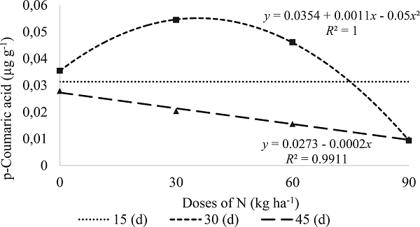 There were no statistical differences between the cultivars regarding p-coumaric acid at the doses of 0, 30, and 90 kg ha-1 at 15 d post-fertilization. At a dose of 60 kg ha-1, the Baianinha cultivar had a higher concentration of this compound than the Caiuá cultivar. In addition, at 30 and 45 d, the Baianinha cultivar exhibited higher contents of the compound when 0, 30, and 60 kg ha-1 of N were applied. At the 90 kg ha-1 dose, the concentrations of this acid did not differ between the two cultivars.