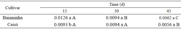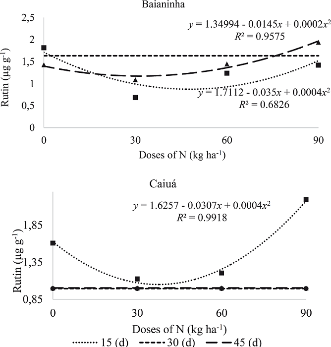 At 15 d, there were no statistical differences in the amounts of rutin between the cultivars when the used doses of N were 0, 30, and 60 kg ha-1. At 30 and 45 d, there were no statistical differences at the doses of 0 and 60 kg ha-1. When using the 90 kg ha-1 dose, the Caiuá cultivar exhibited the highest content of the compound at 15 d. The Baianinha cultivar exhibited the highest contents at 30 and 45 d and at the 30 and 60 kg ha-1 doses. These results may be related to the genetic factors of the cultivars; because the Caiuá cultivar is better adapted to sandy soils, it exhibited a short-term response to the N supplied to the plants, whereas the Baianinha cultivar took a longer time to respond to nitrogen fertilization.
