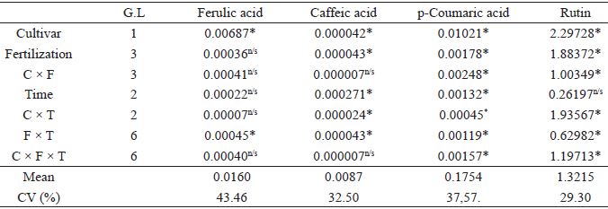 The effect of the triple interaction between the cultivars, doses of N, and time after application of N on the concentrations of rutin and p-coumaric acid was significant. Ferulic acid content was only significantly affected by cultivars and by the interaction between fertilization and time, whereas caffeic acid content was significant affected by the interactions between cultivars and time and between doses of N and time (Table 1).