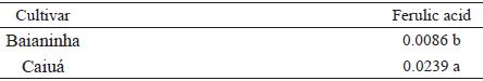 The Caiuá cultivar exhibited higher concentrations of ferulic acid than the Baianinha cultivar (Table 2). This suggests that the content of this secondary compound is related to genetic factors of the cassava plants, as indicated by Ramos et al. (2011). This acid is present in plant tissues, and has inhibitory effects on the growth of fungi and the production of mycotoxins. Moreover, studies have reported its importance as a mechanism of self-preservation, because it strengthens the resistance of the cell wall and protects it from damage caused by microbes and solar radiation (EKMEKCIOGLU et al., 1998; SOUZA et al., 2010). Thus, cultivars with higher contents of this compound may be used in genetic improvement programs, with the aim of selecting materials that are resistant/tolerant to agricultural pests or abiotic factors.