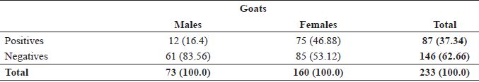 The studied population comprised adult goats (> 6 months of age), of both genders, and without any defined racial pattern. To calculate the number of animals sampled, the following parameters were considered: (a). expected prevalence of 50% (used in order to maximize the sample); (b). absolute error of 7%; and (c). 95% confidence interval, according to the formula for simple random samples. According to these parameters, although the minimum sample “n” was 196 animals, 233 were used. The owners who participated in the survey were chosen by the convenience sampling method (THRUSFIELD, 2007).