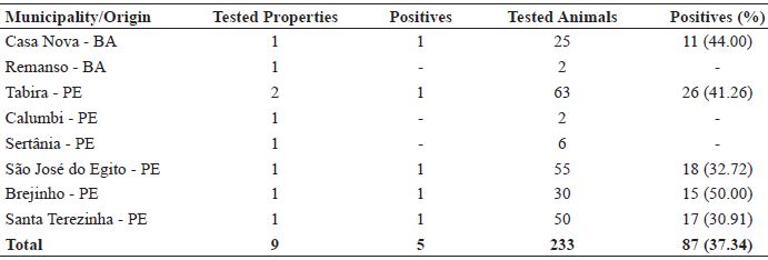 The seropositive properties observed in this study (55.55%) are similar to the results obtained by Carmo et al. (2012) in the Federal District and by Martins et al. (2010) in Bahia, who observed a seropositivity of 50% and 56%, respectively. Nevertheless, it was lower than the result obtained by Carmo et al. (2009), who found that seropositivity was 82.7% in Ceará and 95.9% to 100% in Minas Gerais (GUIMARÃES et al., 2009; SEYFFERT et al., 2010). However, the results from the study reveal that a high percentage of positive properties with a high number of seropositive goats are found in each property studied.