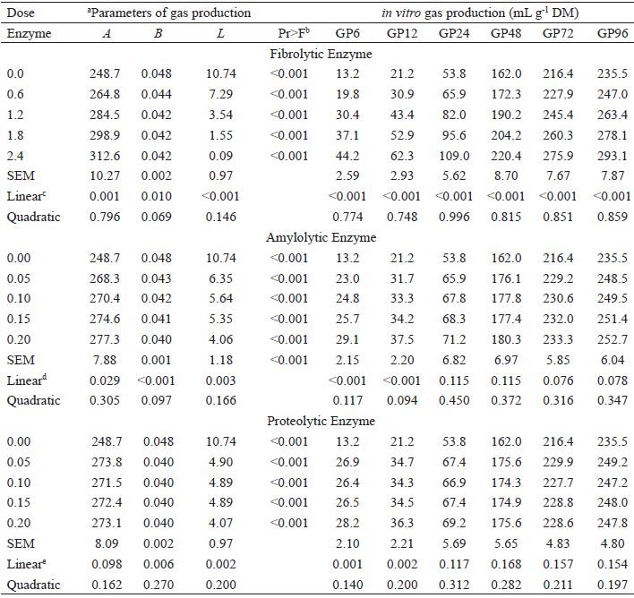 Five different doses of each enzyme were evaluated according to their activity. For fibrolytic enzymes (FIB; Fibroyme, Alltech Inc., Nicholasville, KY) doses of 0, 0.6, 1.2, 1.8 and 2.4 mg mL-1 volume of incubated liquid were used; for amylolytic enzymes (AMZ; Amaize, Alltech Inc., Nicholasville, KY) the doses were 0, 0.05, 0.10, 0.15 and 0.20 mg mL-1 volume of incubated liquid, and for proteolytic enzymes (PRO; VEG PRO, Alltech Inc., Nicholasville, KY), 0, 0.05, 0.10, 0.15 and 0.20 mg mL-1 was included per in the incubated liquid. These levels were defined according to the manufacturer’s recommendations for the daily intake for beef cattle, and extrapolated for in vitro incubation following Tricarico et al. (2005), by calculating the amount of enzyme in relation to the liquid medium (concentration mg mL-1 volume of incubated liquid), not necessarily according to the enzyme:substrate ratio.
