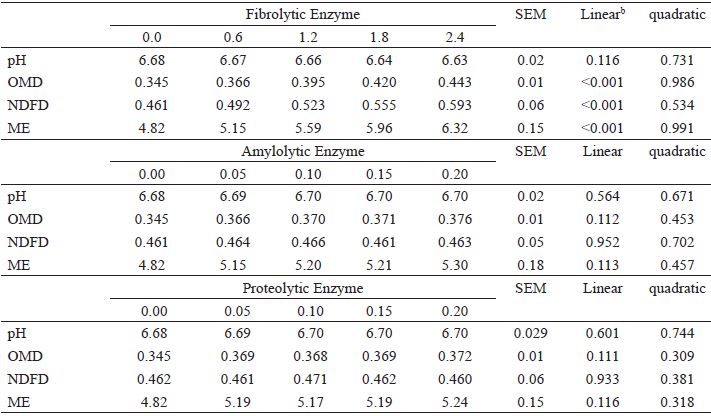 Elghandour et al. (2013) used a multi-enzyme compound, containing endoglucanase, xylanase, protease activities and a high concentration of α-amylase activity (61.5 units g-1). Included in fibrous foods, they found improvements in fermentation parameters and in gas production at the evaluated time points, as did Gado et al. (2009) using the same enzyme preparation. They evaluated fermentative parameters and productive characteristics of lactating dairy cows fed corn silage (70 g kg-1 DM) and concentrate (30 g kg-1 DM), supplemented with 40 g cow day-1 of exogenous enzymes, and observed an increase in the consumption of DM and OM (from 16.1 to 18.2 and from 14.1 to 16.4 kg d-1, respectively), and an improvement in fiber digestibility (NDFD, from 418 to 584 g kg-1). Milk production increased from 12.8 to 15.7 kg d-1 with daily supplementation of the multi-enzyme preparation. These articles suggest that the addition of multi-enzyme preparations may have a greater impact on ruminal fermentation.