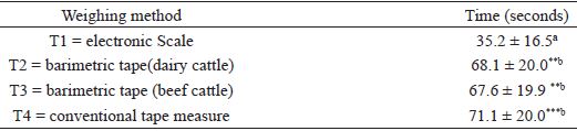 Regarding the time taken to determine weight with tapes, the use of an American fixed containment trunk (COIMMA®) at the time of weighing should be considered, as it facilitates management, since this type of trunk allows complete animal immobilization. The possibility of completely immobilizing the animal promotes the use of tapes for weighing management, especially when animals of zebu breeds are handled, representing most animals in beef cattle production systems in Brazil. Fordyce et al. (1984) observed a more docile temper in taurine breeds compared with zebu animals. The use of this type of trunk may have favored the reduced weighing time with tape. When weighing with an electronic scale, according to Lopes (1997), there is no need for complete animal containment. When the weighing tapes are used for dairy cattle, with specialized breeds, such as the Dutch, management requires the use of a trunk, as these breeds are more docile. Therefore, the availability of a containment trunk during weighing increases management efficiency, especially when complete animal mobilization is necessary. Training staff how to weigh, use tapes, and convert centimeters into body weight, may also have positively influenced the weighing time. Although there was no significant difference, the time taken to use the tape measure may have been numerically high due to consultation with the table when converting centimeters to live bodyweight.