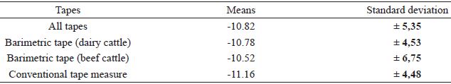 The mean difference (error) between the results obtained with the electronic scale and the tapes was-10.82% (±5.35), when considering all of the genetic groups studied (Table 2) The manufacturers of the barimetric tape note that the weighing error may be up to ±5% (BOVITEC®).