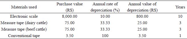 The depreciation of the fixed cost of electronic scales is high, which highlights the need for equipment optimization, as this cost is independent of the quantity of heavy animals. The higher cost of electronic equipment, involving animal precision Zootechnics, according to Lopes et al. (2013), may make it use impossible in many settings. To make the use of electronic equipment viable, it is necessary to evaluate the technological level and quantity of animals, to ensure that the costs associated with the equipment can be “diluted “ with the optimized use of the workforce. This demonstrates the importance of detailed studies on cost estimate, and the effective disbursements as well as equipment depreciation should be considered during the decision-making process. The higher the number of animals, the greater the annual depreciation of equipment will be diluted, with less representation in the unit cost. According to Lopes et al. (2006), an increase in the scale of production significantly influences the depreciation represented in the total fixed cost and total cost, by optimizing the infrastructure of the company. The values considered in this study are presented in Table 3. Electronic weighing of animals could be more profitable if associated with electronic identification and management of flock-monitoring software, eliminating reading errors that occur during the transcription of spreadsheets, individual sheets, and from typing, reducing the time taken to complete the task and increasing reliability, resulting in greater efficiency of the whole system.
