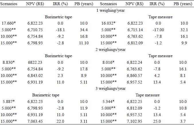 The payback is considered the simplest known method for the economic evaluation of projects, which is be used to estimate the time necessary to recover the invested capital in a particular activity, regardless of the interest rate used (CONTADOR, 1997). In this study, the period required between the initial investment and the time at which the net accumulated profit equals the value of the investment will be 10 years, considering the electronic scale as an investment, and comparing with the barimetric tape. Compared with the measuring tape, the net profit equals the investment over 10 years, which consists of the lifetime of the electronic scale;10 years, one weighing per year, and a minimum number of 16,032 and 17,660 animals, respectively.