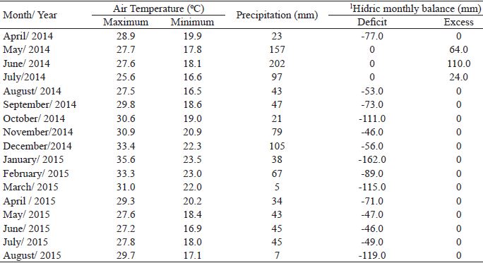 This experiment was conducted at the Animal Science Institute of the Federal Rural University of Rio de Janeiro, Seropédica - RJ, at 22°45’ south latitude and 43°41’ west longitude and at 33 meters altitude. The climate in the region is AW (Köppen), with a dry season from April to September and a hot and rainy season from October to March. Meteorological data on precipitation, air temperature and water balance of the experimental period (April 2014 to August 2015) are presented in Table 1.