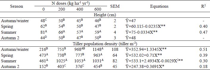 There was an interaction (p<0.05) between nitrogen doses and seasons of the year for height and tiller population density (Table 3). Higher values of height were verified during the summer season, and only for the control treatment were lower values in autumn 2 (44 cm) and winter (48 cm), respectively. There was a negative linear effect during summer and spring, and there was no effect of N dose during autumn/winter (47 cm) and autumn 2 (48 cm). This is due to the high temperatures, small increase in rainfall (Table 1) and favorable conditions of solar radiation of the summer season, which favor the growth and production of C4 plants (LAWLOR, 1987).