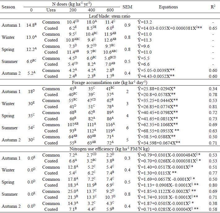 There was an effect (p<0.05) of interaction between dose, urea source and seasons of the year for leaf blade:shoot height ratio, forage accumulation rate of Massai grass, and nitrogen use efficiency during autumn 1, winter and spring of 2014 and summer and autumn of 2015 (Table 4). The values of leaf blade:shoot height ratio of Massai grass (average of 8: 1) are considered high in relation to those obtained for other forage plants, as demonstrated by Brâncio et al. (2003), who evaluated three cultivars of Panicum maximum and reported higher values of leaf blade:stem ratio for cv. Massai grass (7:1) compared to cvs. Tanzania and Mombasa (values between 1:1 and 2:1). These high values of leaf blade:stem ratio of the Massai grass are probably due to the lower weight of their stems, as observed by Brâncio et al. (2003), which implies a higher proportion of leaf blades and better quality of forage produced.