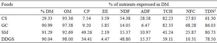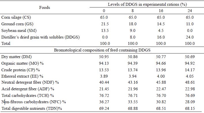 Once possible alternative ingredient that may be used in animal feed is the residue obtained after the processing of corn grain for the production of ethanol in Brazilian distilleries. This ingredient is referred to as distiller’s dried grain with solubles (DDGS). The bromatological composition of DDGS is as follows: 87.0% to 93.0% dry matter (DM); 28.1% to 32.9% crude protein (CP); 8.2% to 16.5% of ethereal extract (EE), 19.7% to 49.5% of neutral detergent fiber (NDF), and 69.6% to 78.0% of total digestible nutrients (TDN) (NUEZ-ORTÍN; YU, 2009; SALIM et al., 2010; GERON et al., 2017b). Studies are needed to determine appropriate levels of DDGS that could be included in ruminant rations (GERON et al., 2017a).