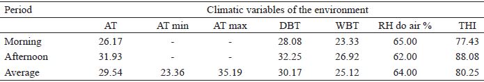 The environmental variables recorded during the experimental period were the ambient temperature (AT), dry bulb temperature (DBT), and wet bulb temperature (WBT). The AT was obtained by means of a taco type thermometer, and DBT and WBT were measured using a dry bulb and a wet bulb thermometer, respectively. The maximum and minimum temperature measurements were obtained by using the maximum and minimum temperature thermometer (VERÍSSIMO et al., 2009).