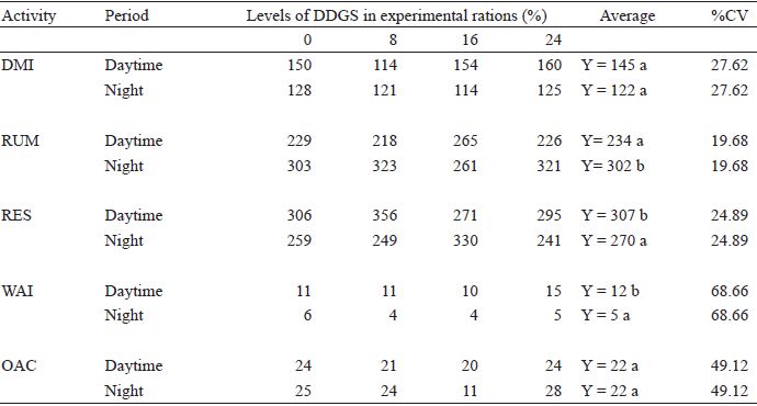 Regardless of DDGS inclusion levels in ovine rations, there was an effect (p < 0.05) of period (diurnal/nocturnal) on the time spent on RUM, RES, and WAI activities. However, these periods did not affect (p > 0.05) the time spent on DMI and OAC (Table 5). Meal provision may have contributed to the results regarding time spent on DMI within the assessment period (day and night), since meals were provided at the beginning of each trial period, i.e. at 06h00 am and 6h00 pm. In addition, the similar consumption among diets containing different levels of DDGS may have contributed to this observation.