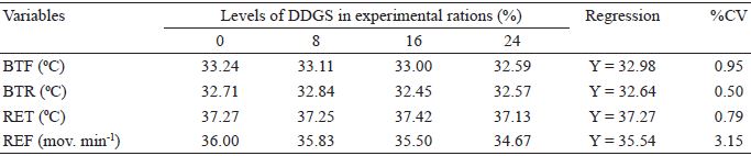 The inclusion of 0, 8, 16, and 24% DDGS in sheep rations did not change (p > 0.05) the physiological parameters measured (Table 6), such as body temperature of the front (BTF), body temperature of the rear (BTR), and rectal temperature (RET) expressed in ºC, and respiratory frequency (REF) expressed in motions per minute (mov.min-1), which had mean values of 32.98 °C, 32.64 °C, 37.27 °C, and 35.54 mov.min-1, respectively.