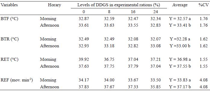 Sheep fed with different levels of DDGS in the diets had REF values of 37.17 mov.min-1 during the afternoon, which was higher (p < 0.05) than in the morning (33.83 mov.min-1, Table 7). Thus, the existence of a significant difference in these physiological parameters confirms that the performance of sheep in the tropical region of Brazil is related to the mechanisms of thermal homeostasis, and through mechanisms that are sensitive or insensitive to heat.
