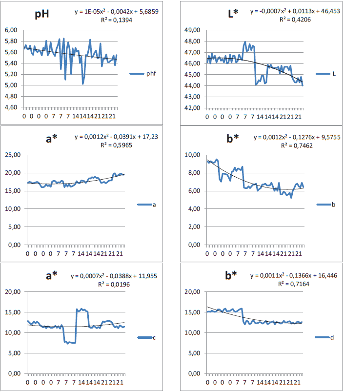 pH was notable among the variables that altered meat quality, as it influenced the other characteristics. The final pH values presented in Table 1 demonstrate that there was no influence of pre-slaughter stress on the animals, with slow development of glycolysis that enabled a stable pH of approximately 5.57. The pH values were similar to those obtained by Aroeira et al. (2016) after 0 (5.61), 7 (5.54), 14 (5.50), and 21 (5.52) days of maturation. Furthermore, the present values are within the acceptable pH range of 5.4-5.8 proposed by Mach et al. (2008) as being adequate for shelf life. The pH behavior of the pH is illustrated in Figure 2. A regression analysis revealed a pH decrease of 0.008 units per day of maturation.