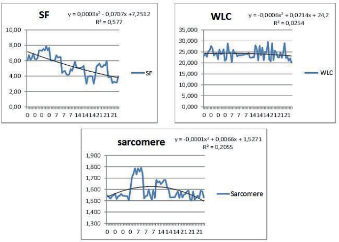 The mean sarcomere length value of matured meats obtained in the present study was 1.59 µm, which is shorter than the 1.97 µm reported by Aroeira et al. (2016). However, according to Koohmaraie et al. (2002), sarcomere lengths decrease in the 24-hour post mortem period, from 2.24 µm at the time of rigor mortis to 1.69 µm after maturation due to the formation of the actomyosin complex with the overlap of myofilaments.
