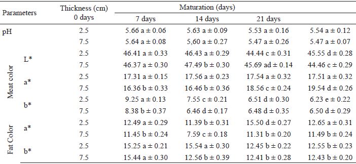 Regarding the meat fat coloration (a* and b*), the intensity of a* of the 2.5-cm cuts after 21 days of maturation resembled that of the non-matured sample, which differed from the 7- and 14-day maturation periods, being lighter at 7 days of maturation (P < 0.05). The 7.5-cm cuts that were matured for 7 days differed from the remaining periods of maturation. The regression analysis showed an increase of 0.601 in this parameter per unit of maturation time across the evaluated meats. The intensity of meat fat b* were similar results from 7 days of maturation period onward for both cut thicknesses (P > 0.05). As the maturation period increased, a slight reduction of the values (0.146) resulted in lighter-shaded fat. This could indicate that the meat fat color tends to stabilize throughout the maturation process, and that the red color intensity variation is influenced by the blood exuded upon exposure of the meat to the ambient temperature.